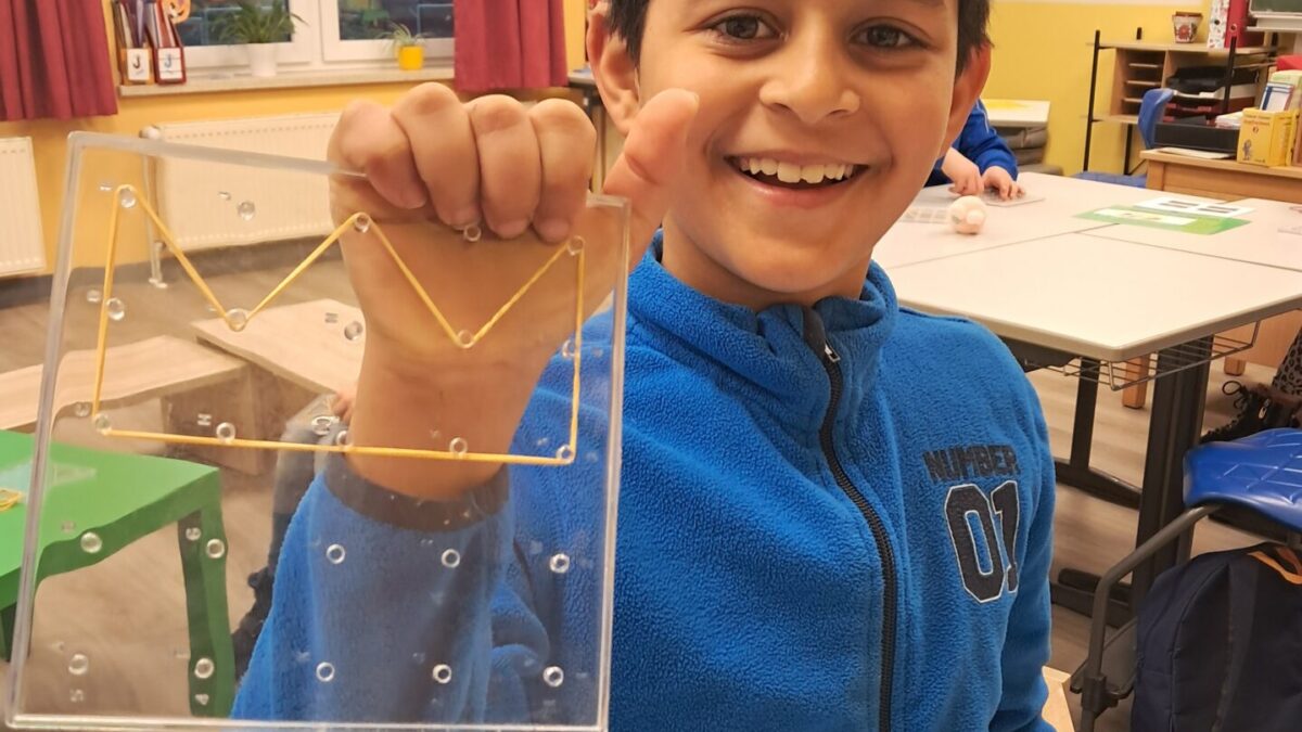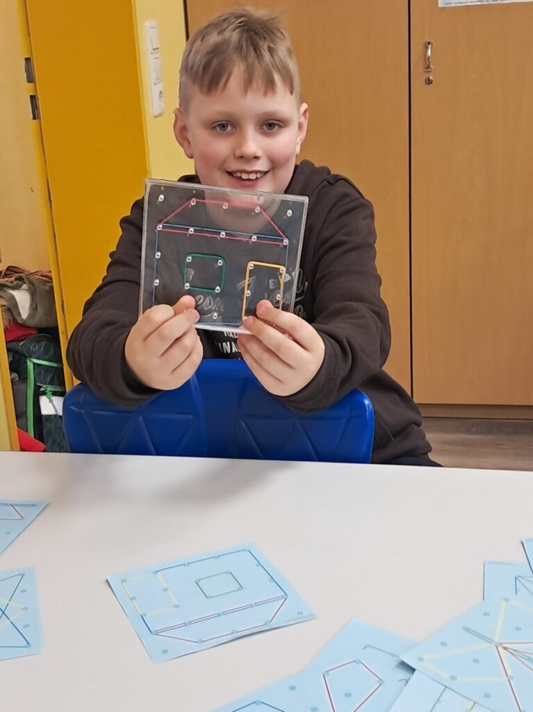 Frau Schwierjohann kündigte zur Begrüßung am Projekttag Mathe einen Tag ohne Zahlen an und blickte in viele erstaunte und fragende Gesichter. Wie konnte das zusammenpassen? Schnell geriet die Frage aber in den Hintergrund, denn die Kinder waren in jahrgangsgemischten Gruppen 1/2 und 3/4 eifrig dabei, Wurfbecher und Boote zu falten, Faltbilder zu erstellen, Figuren auf dem Geobrett zu spannen, Symmetrie- und Tangrambilder zu legen sowie Spiele wie Ubongo, Qwirkle oder Make `n` Break zu spielen. Dabei gab es tatkräftige Unterstützung von einigen Eltern und Großeltern. (Wir sagen DANKE!) Die Geometrie stand im Mittelpunkt - und da brauchte es eben keine Zahlen, um einen tollen Tag zu haben!