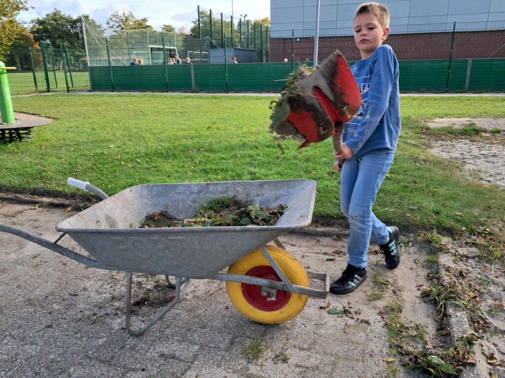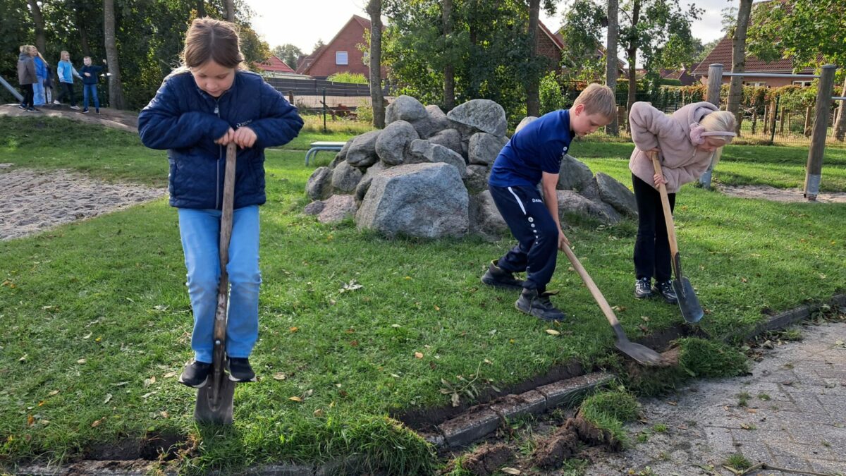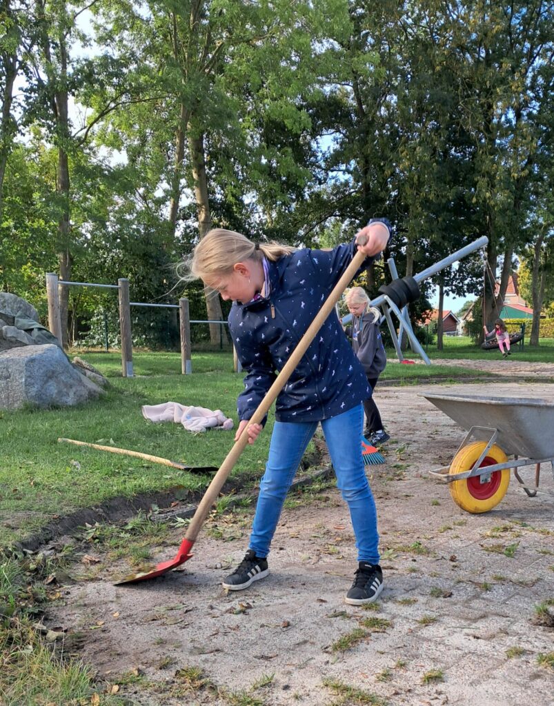 02.09.2025Während die meisten Kinder die Pause nutzen, um auf dem Soccer zu spielen, Seilbahn zu fahren oder sich auf dem Karussell schwindelig zu drehen, haben einige Dritt- und Viertklässler/innen Gefallen daran gefunden, den Schulhof zu verschönern. Mit Schaufeln und Spaten ausgerüstet ziehen sie los, um Kanten abzustechen und Grasbüschel zu entfernen. Mit der Schubkarre wird alles zum Komposthaufen abtransportiert.